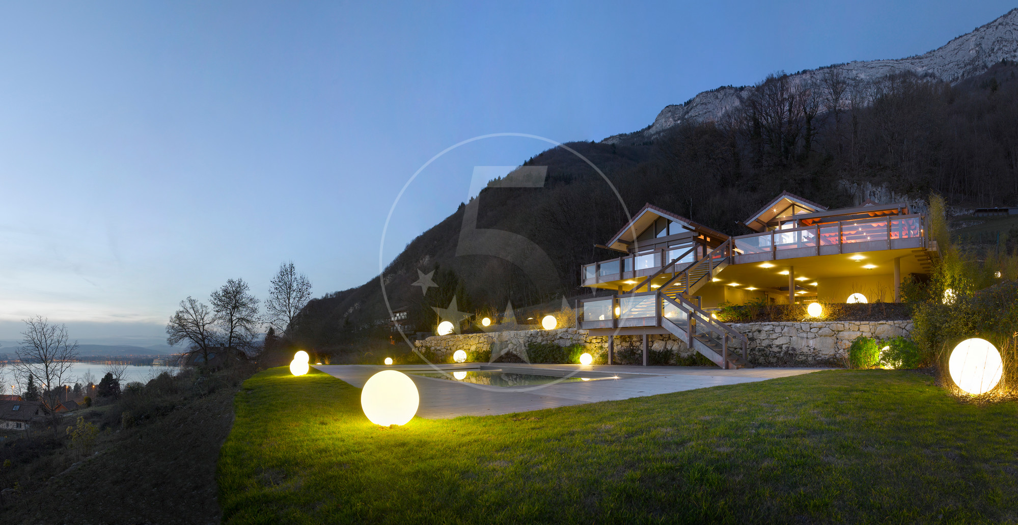 Face au lac d'Annecy et au panorama majestueux l'environnant, cette demeure d’exception s’étend sur 1750m² de terrain paysagé avec terrasses et piscine.